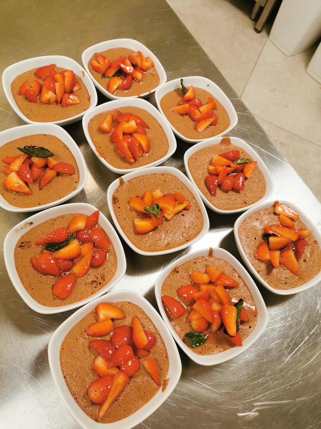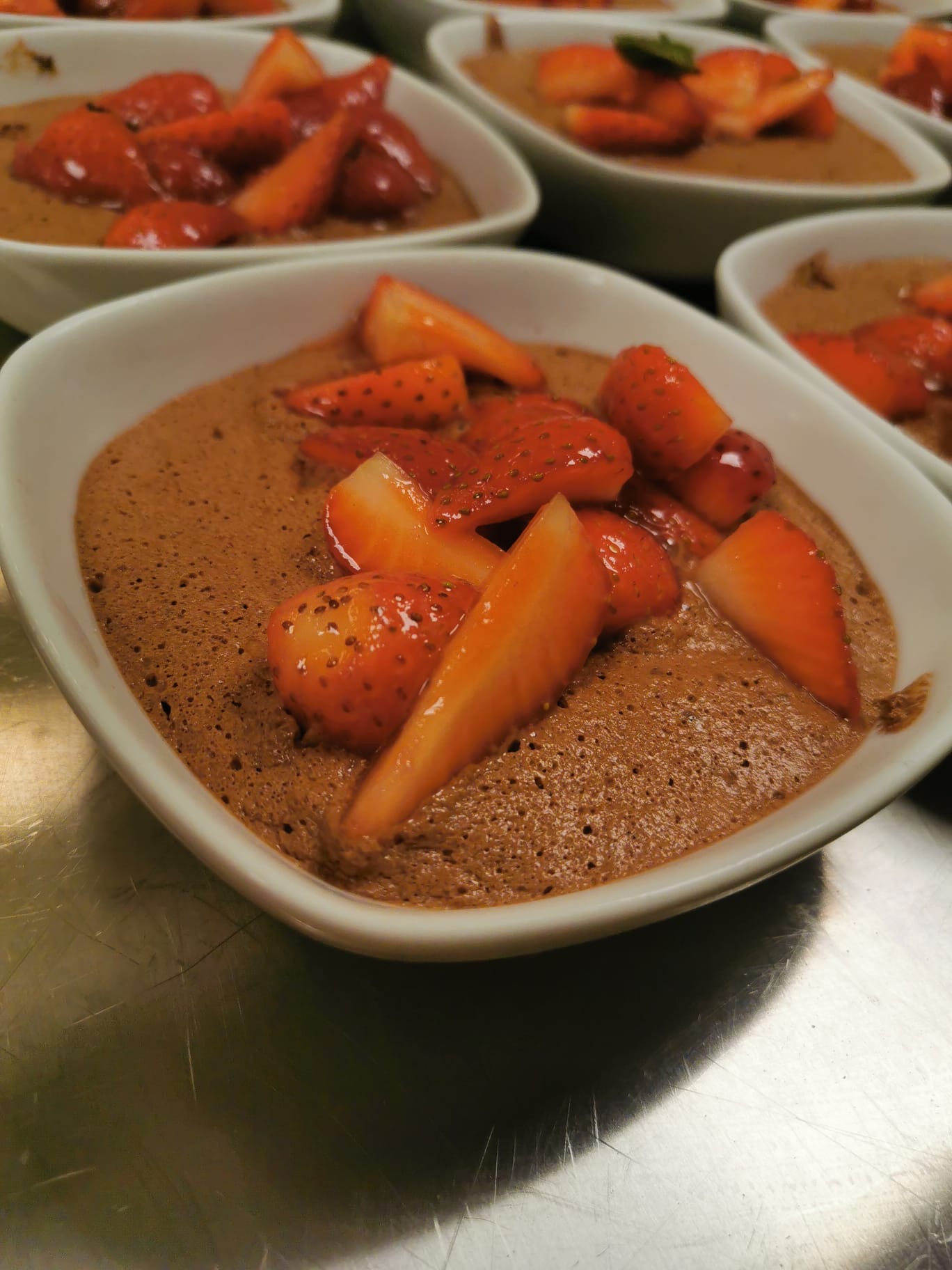 Mousse di “acqua faba” al cioccolato e fragole alla menta.