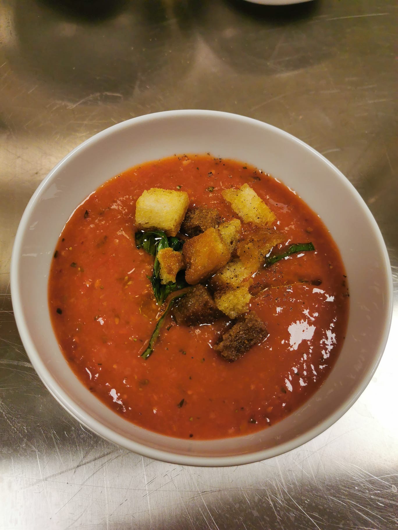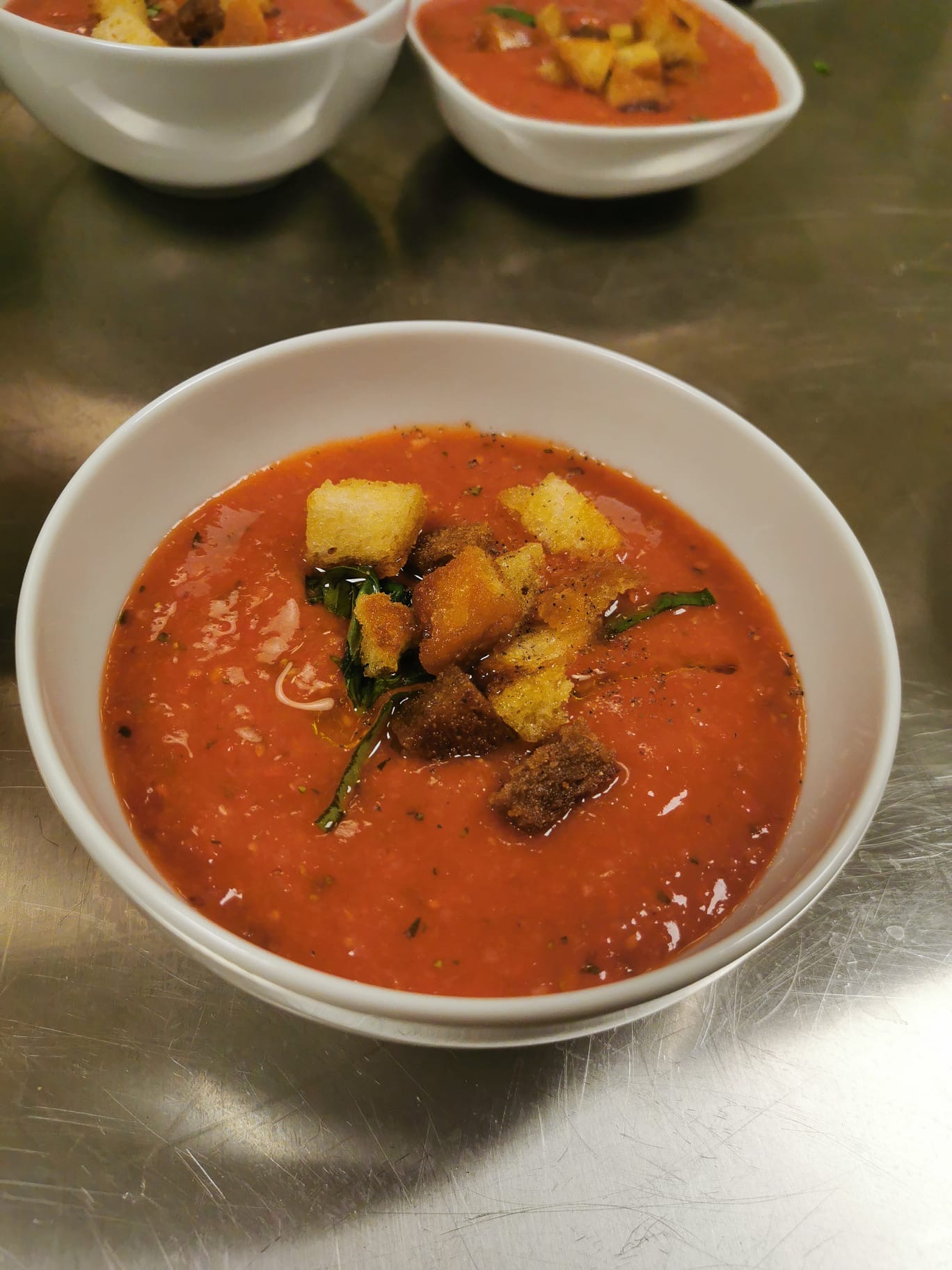 Gaspacho di fragole e datterini con crostini piccanti.